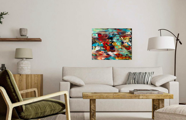 This painting bubbles and roils with reds, blues, blacks and whites. A red swimmer churns across the canvas in mid-stroke through the blurred montage of colors. Can you see him? This painting was created by pouring the various colors on a canvas covered in wet black acrylic, then slowly swiping them across the black goo and letting the paints swirl and mingle. The result is a vibrant, chaotic scene filled with action and color.