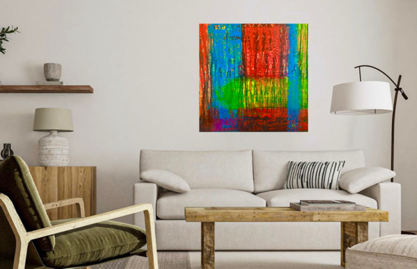 Acrylic, tempera, and plaster on high profile canvas (36" W x 36" H x 1.75" D).