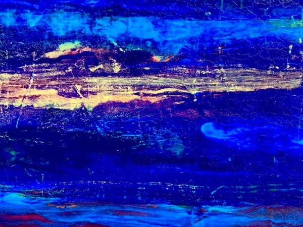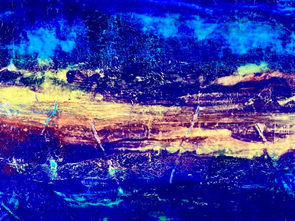 I used acrylic paints in blues, golds, and coppers to give this piece its big sky look. Before I put on the colors though, I applied a plaster based texture to the canvas to give it more character and complexity. In the final step I applied several coats of non-toxic polyurethane to bring out the colors and protect the paint.