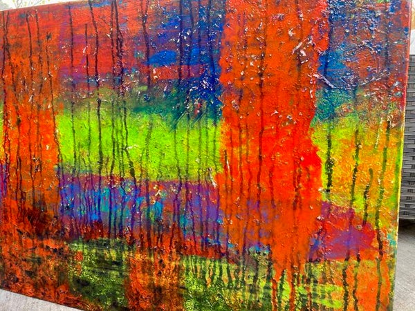 This painting was inspired by nature. When I look at it I see trees standing in brackish water, and the rough texture of the canvas adds turbulence to the landscape where a river runs past a vivid fire or sunrise. In any case there is a lot going on here.