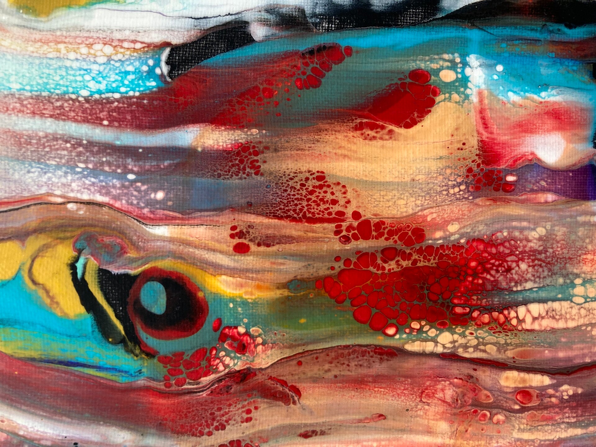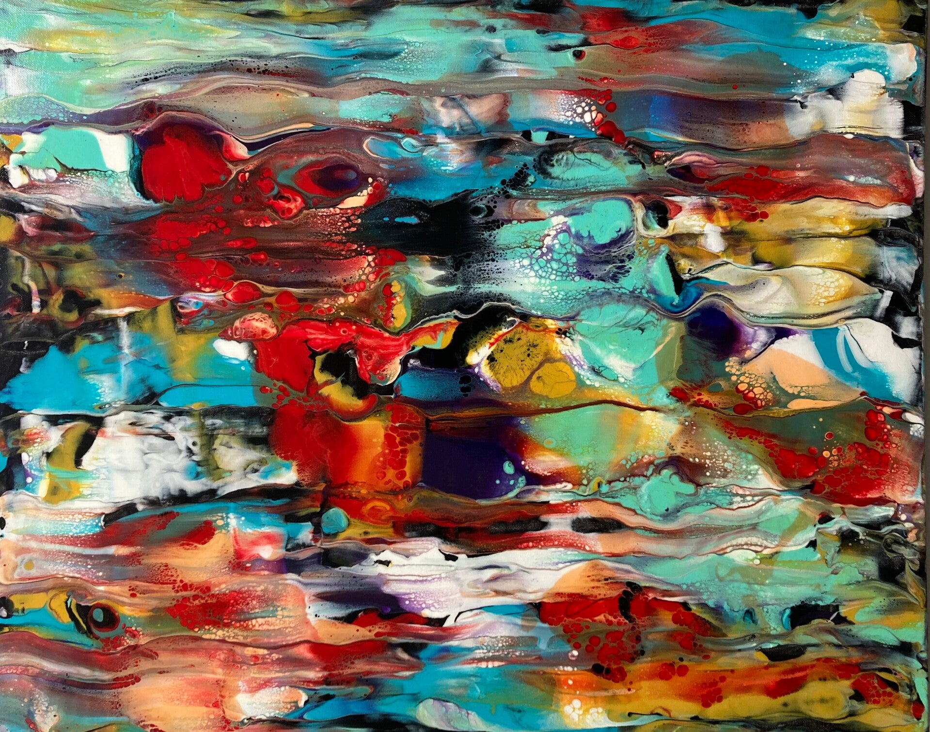 This painting bubbles and roils with reds, blues, blacks and whites. A red swimmer churns across the canvas in mid-stroke through the blurred montage of colors. Can you see him? This painting was created by pouring the various colors on a canvas covered in wet black acrylic, then slowly swiping them across the black goo and letting the paints swirl and mingle. The result is a vibrant, chaotic scene filled with action and color.